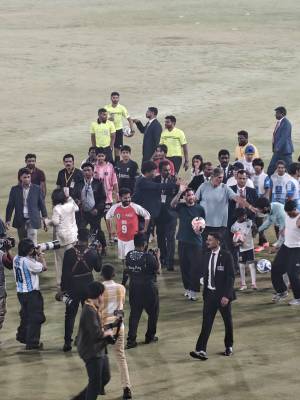 లియోనాల్ మెస్సీ కూడా గ్రౌండ్లోకి దిగి సీఎం రేవంత్ రెడ్డితో కలిసి సరదాగా కాసేపు ఫుట్ బాల్ ఆడారు. మ్యాచ్ పూర్తైన తర్వాత సింగరేణి ఆర్ఆర్ జట్టుకు మెస్సీ ట్రోఫీని అందజేశారు. అలాగే అపర్ణ మెస్సీ ఆల్ స్టార్స్ జట్టుకు ముఖ్యమంత్రి రేవంత్ రెడ్డి ట్రోఫీని అందించారు. మ్యాచ్ సందర్భంగా మెస్సీ, రోడ్రిగో, సీఎం రేవంత్ రెడ్డి స్టేడియంలో చుట్టూ తిరుగుతూ ప్రేక్షకులకు అభివాదం చేశారు. మరోవైపు తమ అభిమాన క్రీడాకారుణ్ని చూసేందుకు ప్రేక్షకులు పెద్ద సంఖ్యలో తరలి వచ్చారు. మ్యాచ్ సందర్భంగా తెలంగాణ గురుకుల పాఠశాలల విద్యార్థులతో మెస్సీ ముచ్చటించారు. గురుకుల పాఠశాలల నుంచి వచ్చిన నాలుగు జూనియర్ టీమ్స్తో మాట్లాడిన మెస్సీ, వారికి ఫుట్బాల్ మెళకువలు అందించారు. కాంగ్రెస్ అగ్రనేత రాహుల్ గాంధీ, ప్రియాంకగాంధీ కుమారుడు, కుమార్తె హాజరై మ్యాచ్ను చూశారు.