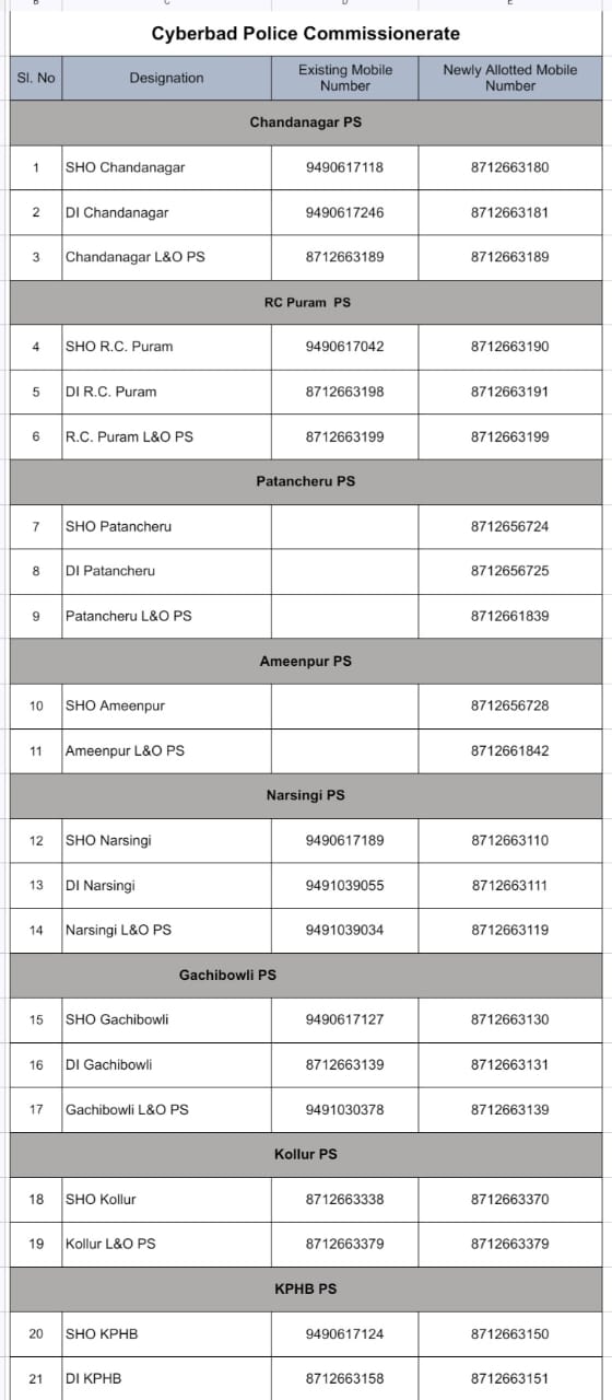సైబరాబాద్ పోలీస్ కమిషరేట్లోని పోలీసు అధికారుల ఫోన్ నెంబర్లు మారాయి. సైబరాబాద్ సీపీతో పాటు ఇతర ఉన్నతాధికారుల పాత ఫోన్ నెంబర్ల స్థానంలో కొత్త ఫోన్ నెంబర్లు వచ్చాయి. పోలీస్ అధికారుల అధికారిక ఫోన్ నెంబర్లు ఇతర సిరీస్ ల నుంచి గత కొద్ది కాలంగా ఇతర పోలీస్ యూనిట్లు వాడుతున్న 87126 సిరీస్ కు మారుతున్నారు.