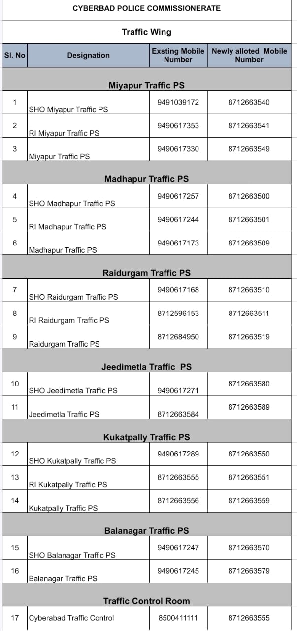 గతంలో పోలీస్ అధికారుల వద్ద ఉన్న పాత అధికారిక నెంబర్లు ఇక పై పనిచేయవనే విషయాన్ని ప్రజలు గమనించాలని సైబరాబాద్ పోలీసులు ఒక ప్రకటనలో తెలియజేశారు. రేపటి నుండి (04.01.2026) కొత్త అధికారిక ఫోన్ నెంబర్ లలో పోలీస్ అధికారులు అందుబాటులో ఉంటారని సైబరాబాద్ పోలీసులు తెలిపారు.